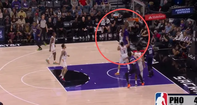 克利福德翻身后仰强投被帽,阿丘瓦拿到地板球后面对前来扑防的布克:先是虚晃,